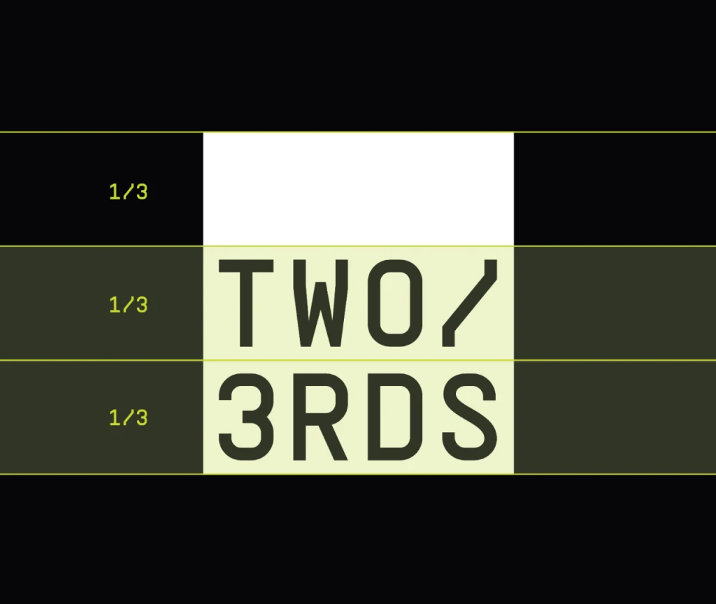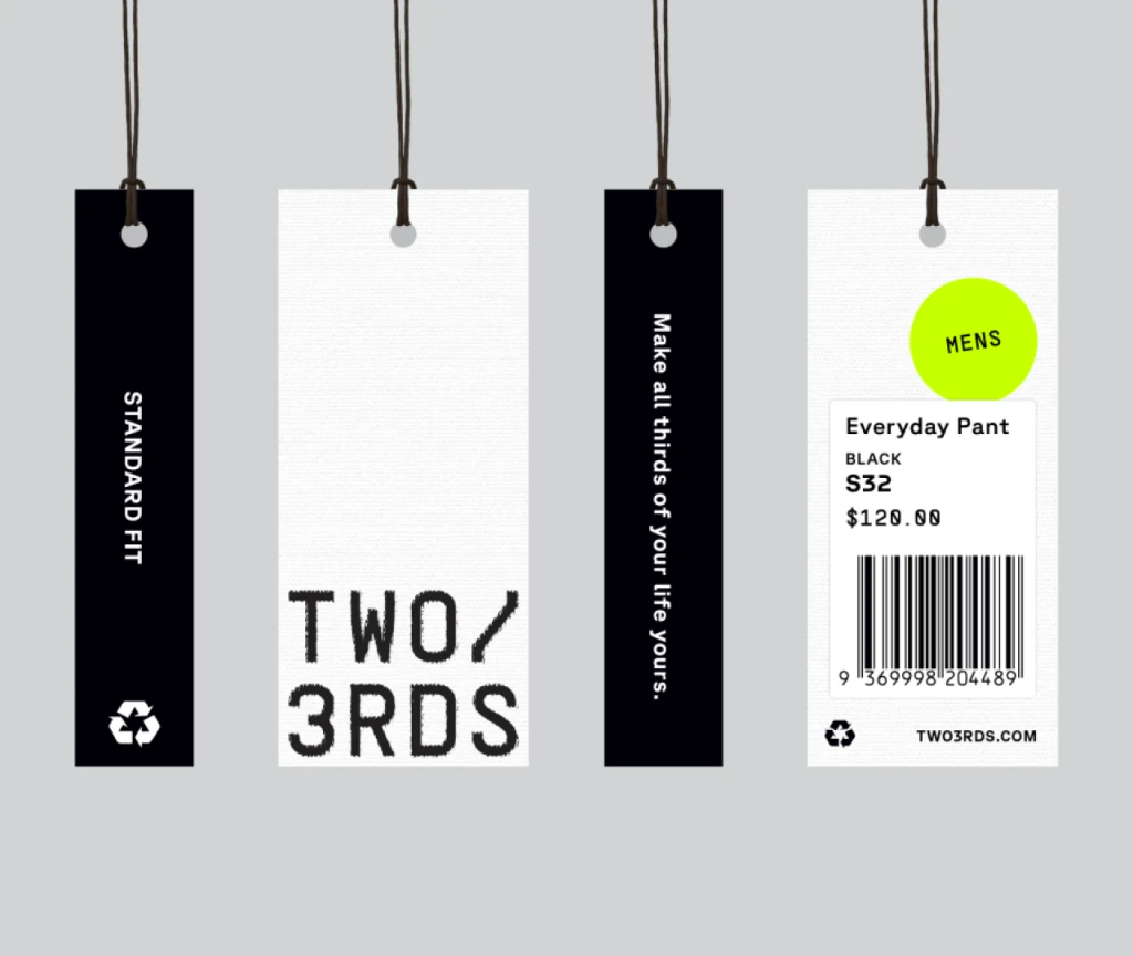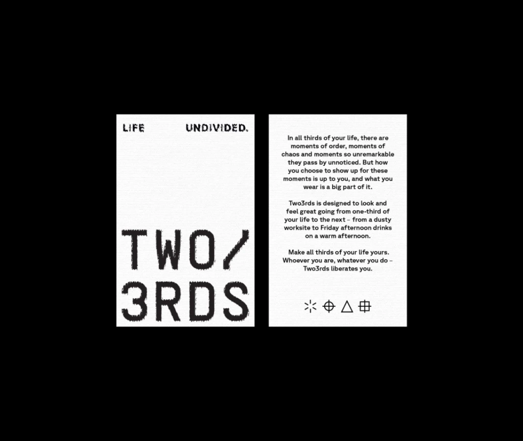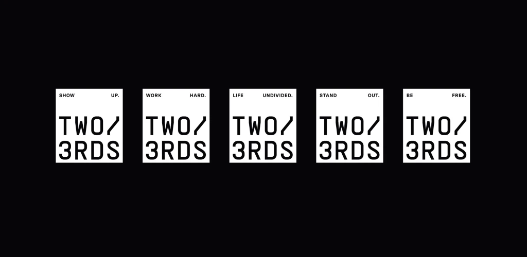Logo Two3rds mencerminkan nama mereknya, menggambarkan esensi kehidupan sehari-hari banyak orang: ⅓ didedikasikan untuk bekerja, ⅓ untuk melakukan hal yang mereka cintai. Untuk memberikan sentuhan personal pada inspirasi ini, logomark dari logo Two3rds berbentuk seperti label gantungan pakaian, melengkapi narasi visual tentang keterkaitan kita dengan pengalaman sehari-hari.